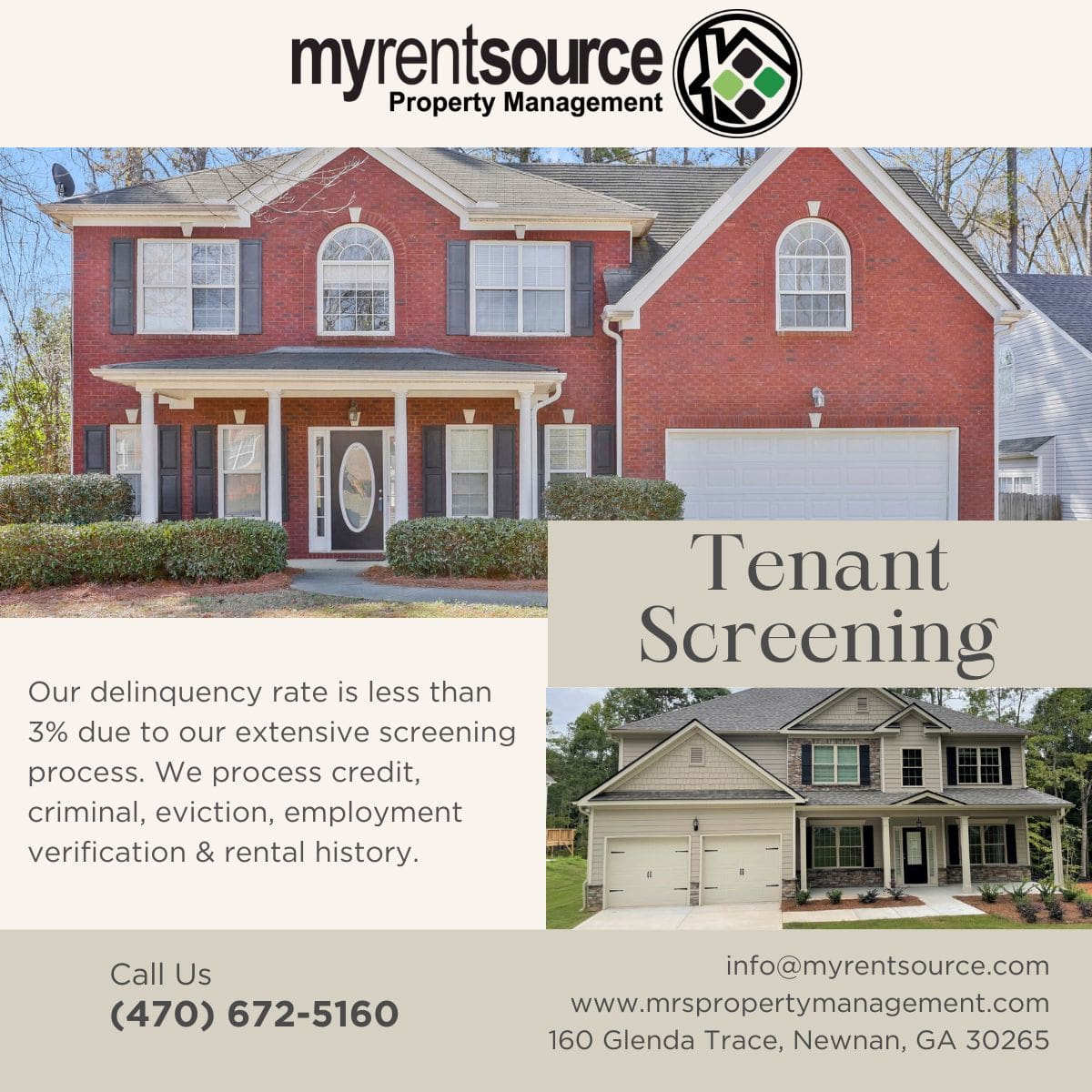 Our delinquency rate is less than 3% due to our extensive screening process. We process credit, criminal, eviction, employment verification & rental history.